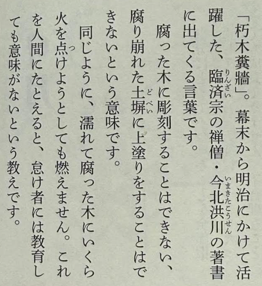 朽木糞牆 Well Being 2026.03.24 知らない言葉に出会うと嬉しくなる。 朽木糞牆(きゅうぼくふんしょう) とんでもない怠け者のことをたとえた四字熟語です。【朽木】は、腐った木のことです。腐った木には彫刻を施すことが出来ない、と言う意味を込めています。【糞牆】は、腐って崩れた牆(土塀)のことです。腐って崩れた牆には上塗りが出来ない、と言う意味を込めています。 怠け者にいくら関わっても無駄なこと。 相手を見極めることも大事なこと。 これも、ウェルビーイング!